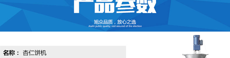 名称XZ-30杏仁饼机 电源220/380V(见机器名牌) 功率1.8kw 产量50-60pcs/min 尺寸2000*1950*1460mm 重量330kg 规格 其他