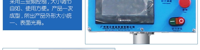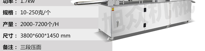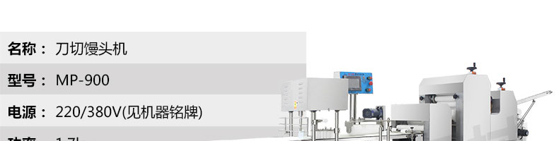 名称MP900型刀切馒头成型机 电源220/380V(见机器名牌) 功率1.7kw 产量2000-7200个/小时 尺寸3800*600*1450mm 重量450kg 规格10-250克/个 其他三段压面